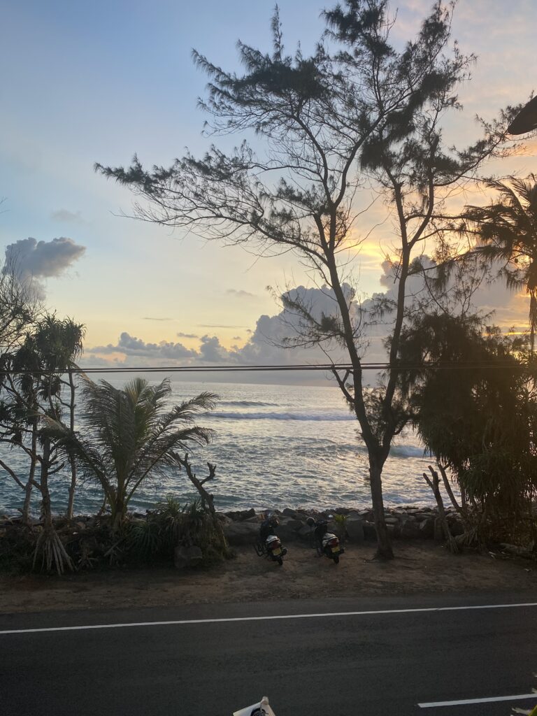 Le Cafe became a morning ritual. After surfing, we perched above the rocks, boards drying nearby, salt still clinging to our skin. Strong coffee arrived first. Breakfast followed. We traded stories of life back home and on the road – Indonesia, Europe, plans half-formed and others already fading. Conversations stretched longer than intended, often requiring several coffees before we finally stood to leave.